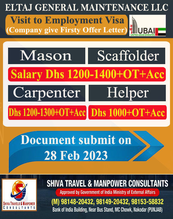 UAE ਦੀ Eltaj General Maintenance LLC Company ਨੂੰ ਕਾਰੀਗਰਾਂ ਦੀ ਭਾਰੀ ਸੰਖਿਆਂ ਵਿੱਚ ਲੋੜ ਹੈ ਚੰਗੀ ਤਨਖਾਹ, ਉਵਰ ਟਾਇਮ ਅਤੇ ਹੋਰ ਸਹੂਲਤਾਂ l Document Submit On 28 Fab 2023 ਸੰਪਰਕ ਕਰੋ . Shiva Travel & manpowar Consultants 9814920432 ਸਾਡਾ whatsapp ਗਰੁੱਪ join ਕਰੋ ਨਵੀ ਡਿਮਾਂਡ ਲਈ https://chat.whatsapp.com/F88Q4Bpm089KHXCVk6LENt Visit us: https://shivatradetestcentre.com/applynow/ ਹੋਰ ਡੀਮਾਂਡ…