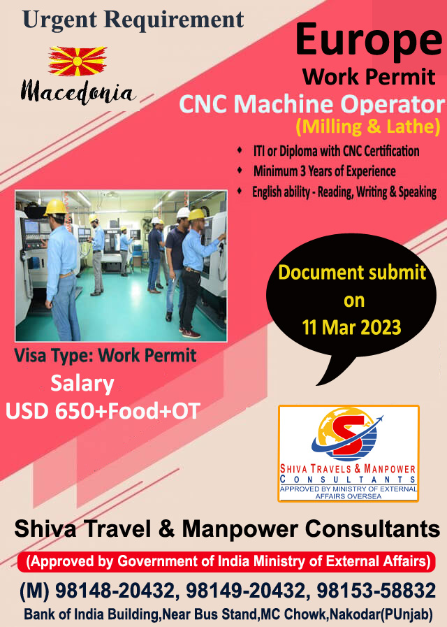 Macedonia ਦੀ Company ਨੂੰ ਕਾਰੀਗਰਾਂ ਦੀ ਭਾਰੀ ਸੰਖਿਆਂ ਵਿੱਚ ਲੋੜ ਹੈ ਚੰਗੀ ਤਨਖਾਹ, ਉਵਰ ਟਾਇਮ ਅਤੇ ਹੋਰ ਸਹੂਲਤਾਂ l Document Submit On 11 Mar 2023 ਸੰਪਰਕ ਕਰੋ . Shiva Travel & manpowar Consultants 9814920432 ਸਾਡਾ whatsapp ਗਰੁੱਪ join ਕਰੋ ਨਵੀ ਡਿਮਾਂਡ ਲਈ https://chat.whatsapp.com/F88Q4Bpm089KHXCVk6LENt Visit us: https://shivatradetestcentre.com/applynow/ ਹੋਰ ਡੀਮਾਂਡ ਲਈ ਜਾਂ ਹੋਰ ਜਾਣਕਾਰੀ…