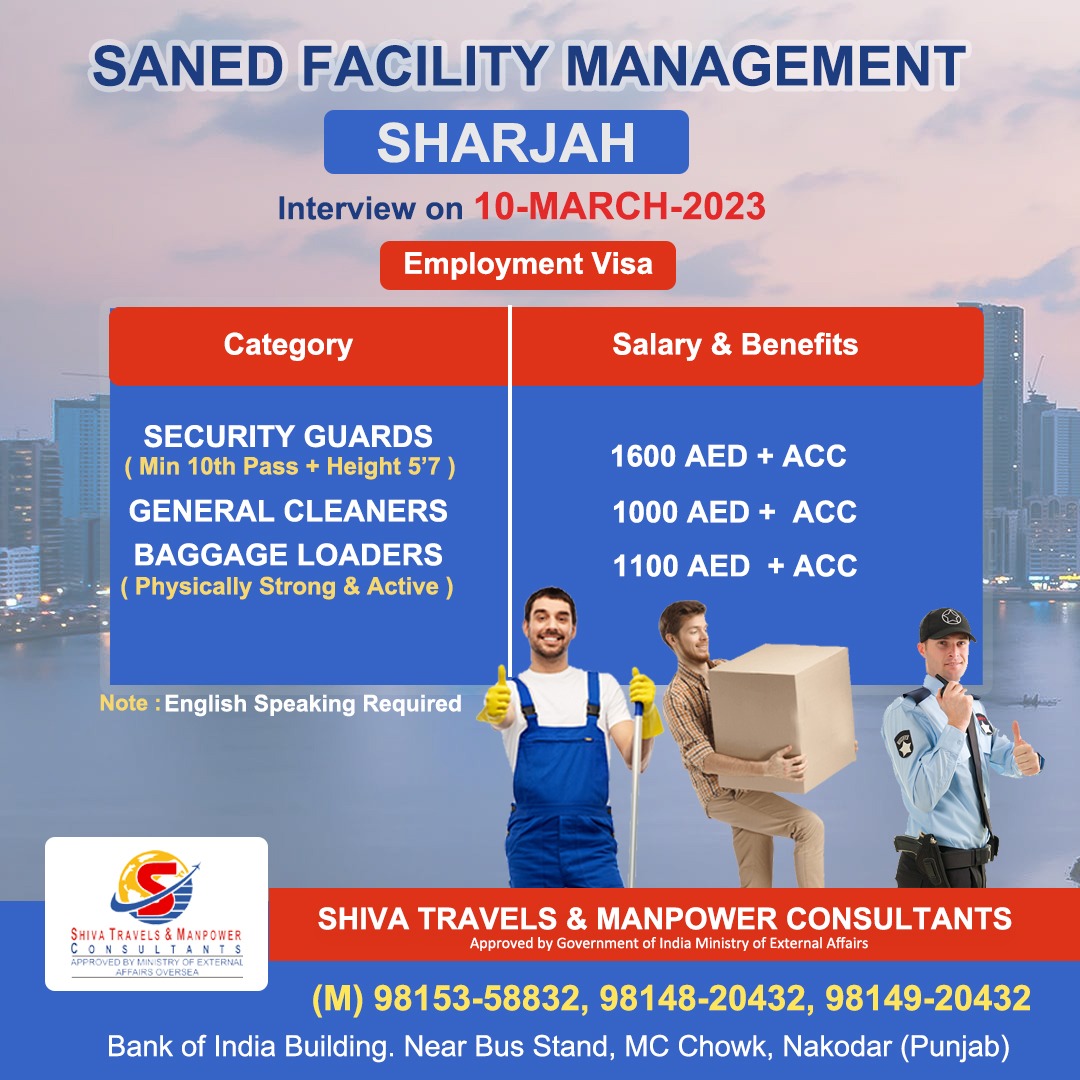 Sharjah ਦੀ Saned Facility Company ਨੂੰ ਕਾਰੀਗਰਾਂ ਦੀ ਭਾਰੀ ਸੰਖਿਆਂ ਵਿੱਚ ਲੋੜ ਹੈ ਚੰਗੀ ਤਨਖਾਹ, ਉਵਰ ਟਾਇਮ ਅਤੇ ਹੋਰ ਸਹੂਲਤਾਂ l Interview On 10 Mar 2023 ਸੰਪਰਕ ਕਰੋ . Shiva Travel & manpowar Consultants 9814920432 ਸਾਡਾ whatsapp ਗਰੁੱਪ join ਕਰੋ ਨਵੀ ਡਿਮਾਂਡ ਲਈ https://chat.whatsapp.com/F88Q4Bpm089KHXCVk6LENt Visit us: https://shivatradetestcentre.com/applynow/ ਹੋਰ ਡੀਮਾਂਡ ਲਈ ਜਾਂ ਹੋਰ…