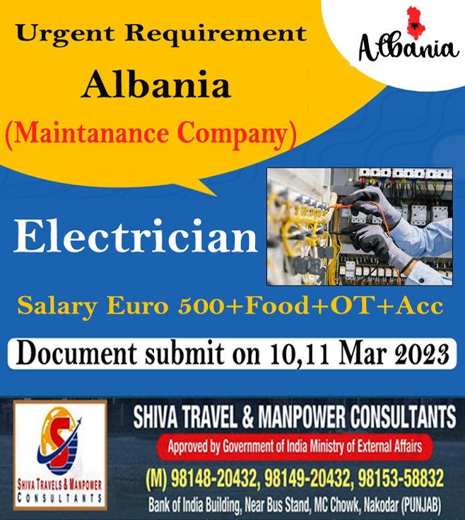 Albania ਦੀ Maintanance Company ਨੂੰ ਕਾਰੀਗਰਾਂ ਦੀ ਭਾਰੀ ਸੰਖਿਆਂ ਵਿੱਚ ਲੋੜ ਹੈ ਚੰਗੀ ਤਨਖਾਹ, ਉਵਰ ਟਾਇਮ ਅਤੇ ਹੋਰ ਸਹੂਲਤਾਂ l Document Submit On 10,11 Mar 2023 ਸੰਪਰਕ ਕਰੋ . Shiva Travel & manpowar Consultants 9814920432 ਸਾਡਾ whatsapp ਗਰੁੱਪ join ਕਰੋ ਨਵੀ ਡਿਮਾਂਡ ਲਈ https://chat.whatsapp.com/F88Q4Bpm089KHXCVk6LENt Visit us: https://shivatradetestcentre.com/applynow/ ਹੋਰ ਡੀਮਾਂਡ ਲਈ ਜਾਂ ਹੋਰ…
