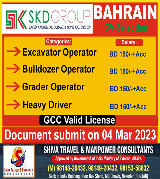 Bahrain ਦੀ S K D GROUP ਨੂੰ ਕਾਰੀਗਰਾਂ ਦੀ ਭਾਰੀ ਸੰਖਿਆਂ ਵਿੱਚ ਲੋੜ ਹੈ ਚੰਗੀ ਤਨਖਾਹ, ਉਵਰ ਟਾਇਮ ਅਤੇ ਹੋਰ ਸਹੂਲਤਾਂ l Document Submit On 04 Mar 2023 ਸੰਪਰਕ ਕਰੋ . Shiva Travel & manpowar Consultants 9814920432 ਸਾਡਾ whatsapp ਗਰੁੱਪ join ਕਰੋ ਨਵੀ ਡਿਮਾਂਡ ਲਈ https://chat.whatsapp.com/F88Q4Bpm089KHXCVk6LENt Visit us: https://shivatradetestcentre.com/applynow/ ਹੋਰ ਡੀਮਾਂਡ ਲਈ…