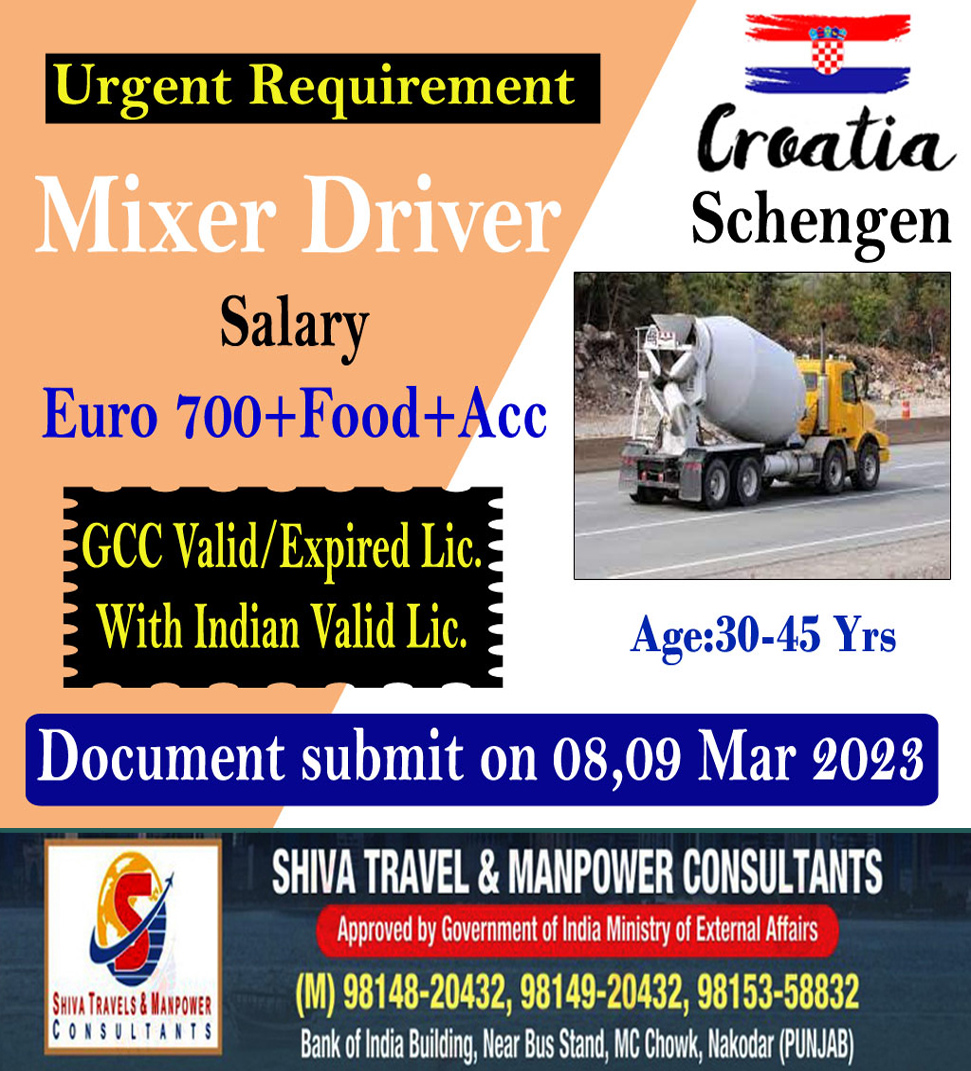 Croatia ਦੀ Company ਨੂੰ ਕਾਰੀਗਰਾਂ ਦੀ ਭਾਰੀ ਸੰਖਿਆਂ ਵਿੱਚ ਲੋੜ ਹੈ ਚੰਗੀ ਤਨਖਾਹ, ਉਵਰ ਟਾਇਮ ਅਤੇ ਹੋਰ ਸਹੂਲਤਾਂ l Document Submit On 08,09Mar 2023 ਸੰਪਰਕ ਕਰੋ . Shiva Travel & manpowar Consultants 9814920432 ਸਾਡਾ whatsapp ਗਰੁੱਪ join ਕਰੋ ਨਵੀ ਡਿਮਾਂਡ ਲਈ https://chat.whatsapp.com/F88Q4Bpm089KHXCVk6LENt Visit us: https://shivatradetestcentre.com/applynow/ ਹੋਰ ਡੀਮਾਂਡ ਲਈ ਜਾਂ ਹੋਰ ਜਾਣਕਾਰੀ ਲਈ…