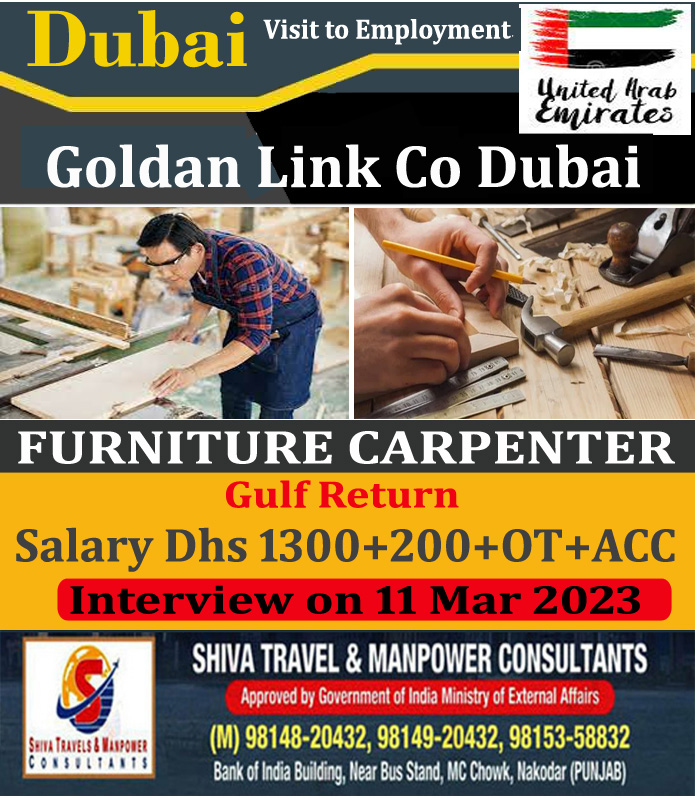 UAE ਦੀ Goldan Link Company ਨੂੰ ਕਾਰੀਗਰਾਂ ਦੀ ਭਾਰੀ ਸੰਖਿਆਂ ਵਿੱਚ ਲੋੜ ਹੈ ਚੰਗੀ ਤਨਖਾਹ, ਉਵਰ ਟਾਇਮ ਅਤੇ ਹੋਰ ਸਹੂਲਤਾਂ l Interview On 11 Mar 2023 ਸੰਪਰਕ ਕਰੋ . Shiva Travel & manpowar Consultants 9814920432 ਸਾਡਾ whatsapp ਗਰੁੱਪ join ਕਰੋ ਨਵੀ ਡਿਮਾਂਡ ਲਈ https://chat.whatsapp.com/F88Q4Bpm089KHXCVk6LENt Visit us: https://shivatradetestcentre.com/applynow/ ਹੋਰ ਡੀਮਾਂਡ ਲਈ ਜਾਂ ਹੋਰ…