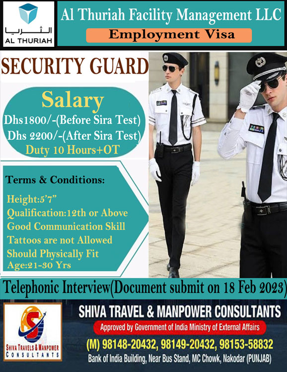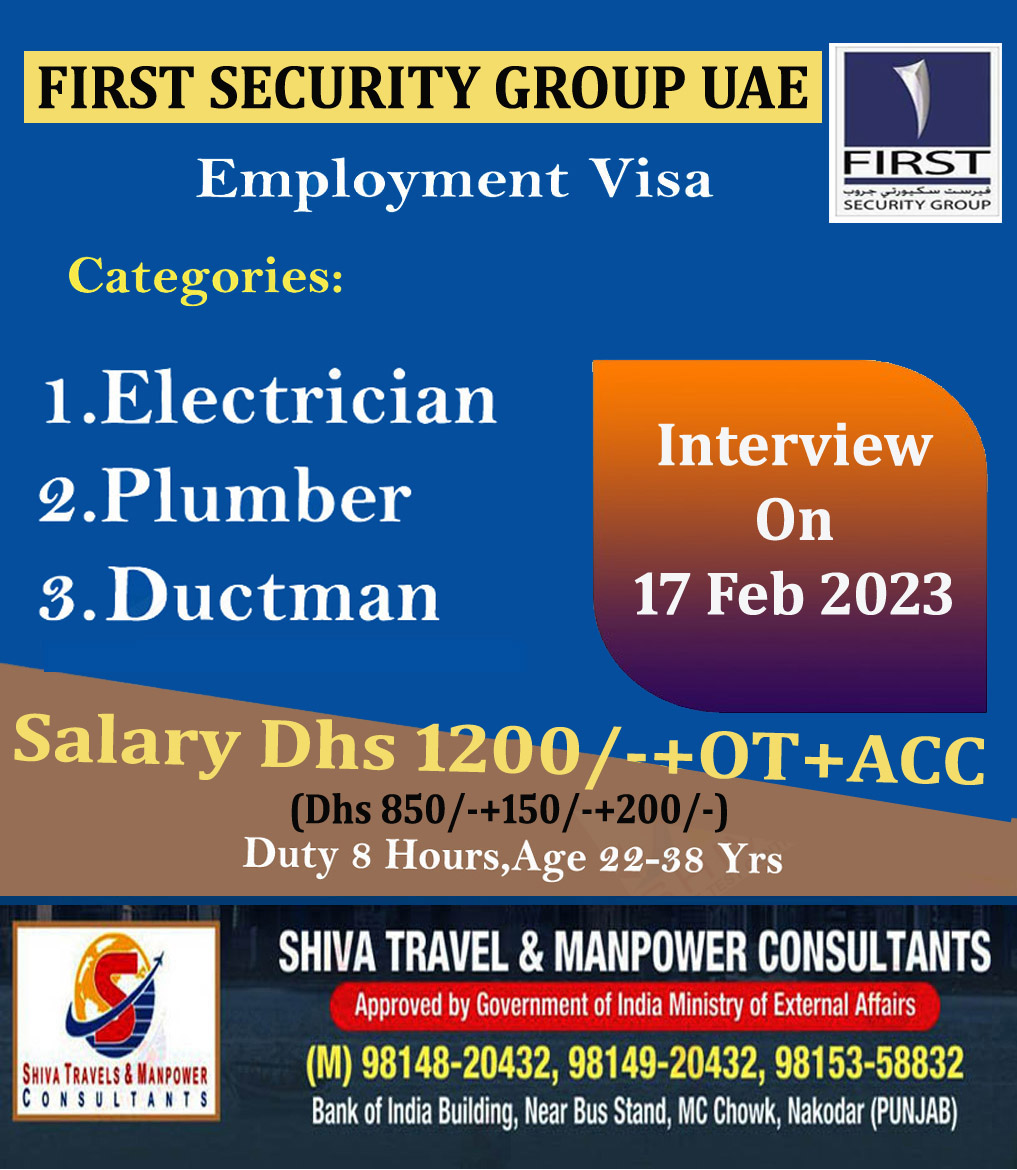 UAE ਦੀ First Security Group Company ਨੂੰ ਕਾਰੀਗਰਾਂ ਦੀ ਭਾਰੀ ਸੰਖਿਆਂ ਵਿੱਚ ਲੋੜ ਹੈ ਚੰਗੀ ਤਨਖਾਹ, ਉਵਰ ਟਾਇਮ ਅਤੇ ਹੋਰ ਸਹੂਲਤਾਂ l Interview On 17 Feb 2023 ਸੰਪਰਕ ਕਰੋ . Shiva Travel & manpowar Consultants 9814920432 ਸਾਡਾ whatsapp ਗਰੁੱਪ join ਕਰੋ ਨਵੀ ਡਿਮਾਂਡ ਲਈ https://chat.whatsapp.com/F88Q4Bpm089KHXCVk6LENt Visit us: https://shivatradetestcentre.com/applynow/ ਹੋਰ ਡੀਮਾਂਡ ਲਈ ਜਾਂ…