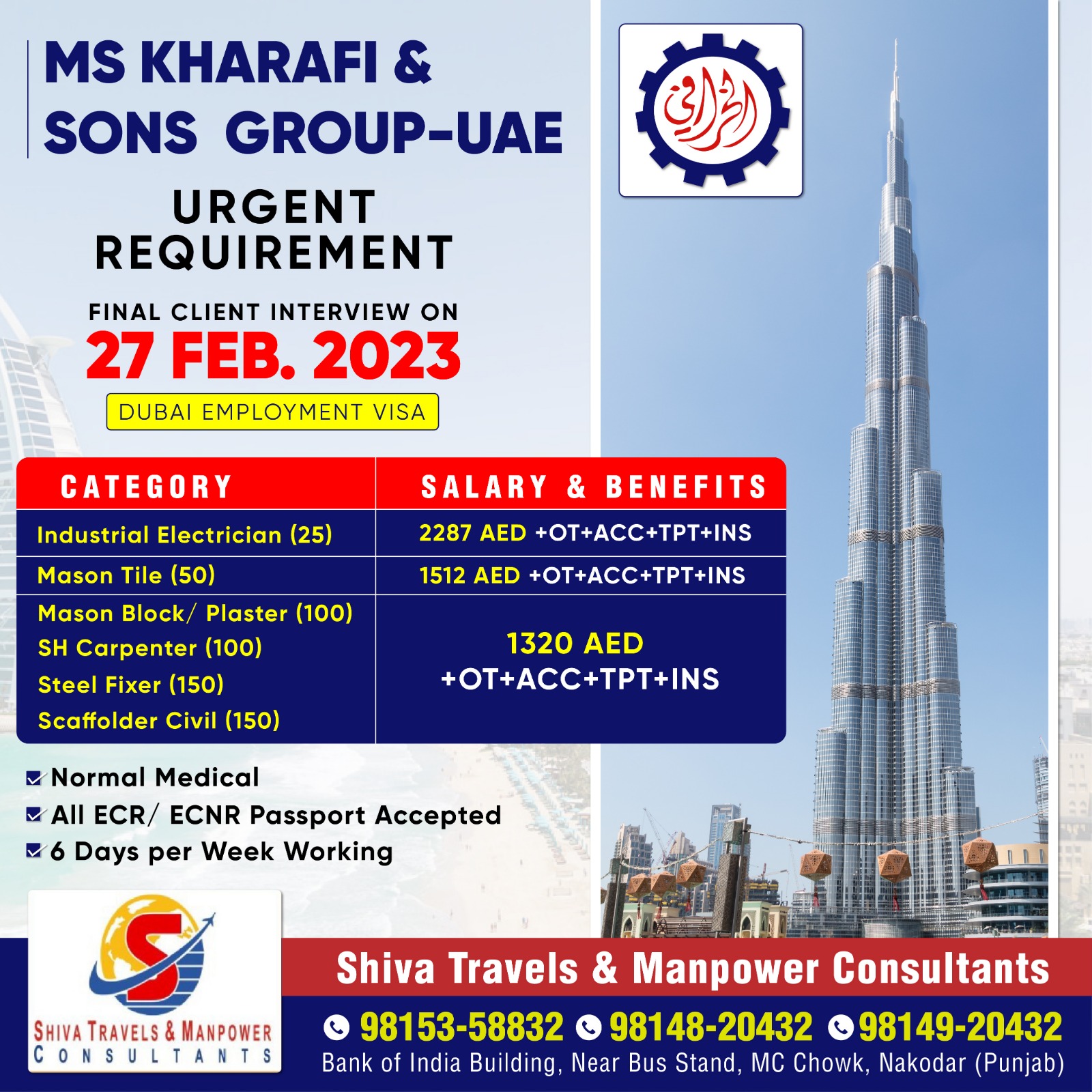 UAE ਦੀ Ms Kharafi Sons Group Company ਨੂੰ ਕਾਰੀਗਰਾਂ ਦੀ ਭਾਰੀ ਸੰਖਿਆਂ ਵਿੱਚ ਲੋੜ ਹੈ ਚੰਗੀ ਤਨਖਾਹ, ਉਵਰ ਟਾਇਮ ਅਤੇ ਹੋਰ ਸਹੂਲਤਾਂ l Interview On 27 Fab 2023 ਸੰਪਰਕ ਕਰੋ . Shiva Travel & manpowar Consultants 9814920432 ਸਾਡਾ whatsapp ਗਰੁੱਪ join ਕਰੋ ਨਵੀ ਡਿਮਾਂਡ ਲਈ https://chat.whatsapp.com/F88Q4Bpm089KHXCVk6LENt Visit us: https://shivatradetestcentre.com/applynow/ ਹੋਰ ਡੀਮਾਂਡ ਲਈ…