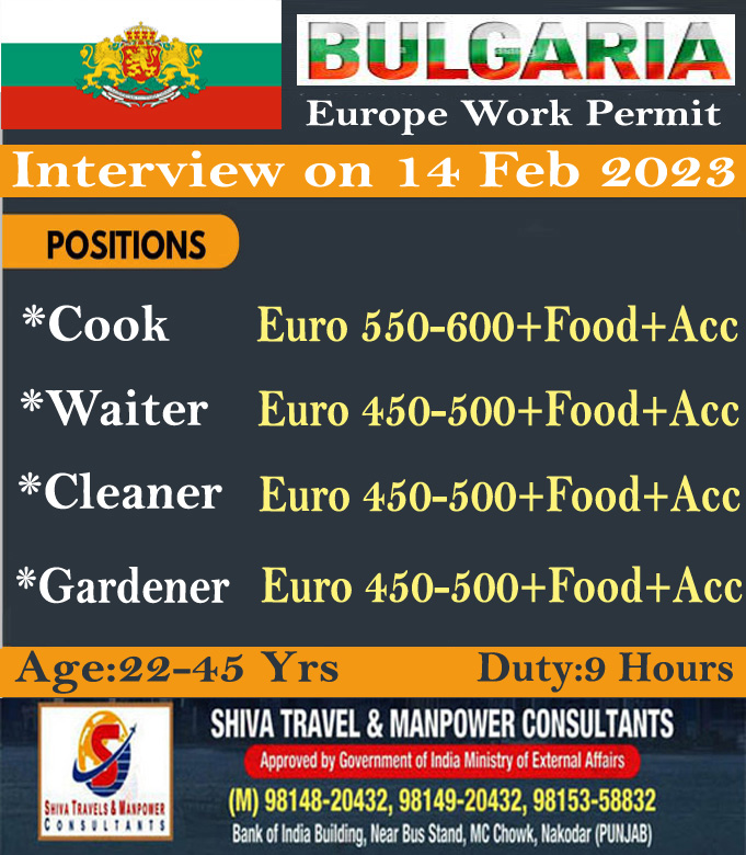 Bulgaria ਦੀ Company ਨੂੰ ਕਾਰੀਗਰਾਂ ਦੀ ਭਾਰੀ ਸੰਖਿਆਂ ਵਿੱਚ ਲੋੜ ਹੈ ਚੰਗੀ ਤਨਖਾਹ, ਉਵਰ ਟਾਇਮ ਅਤੇ ਹੋਰ ਸਹੂਲਤਾਂ l Interview On 14 Feb 2023 ਸੰਪਰਕ ਕਰੋ . Shiva Travel & manpowar Consultants 9814920432 ਸਾਡਾ whatsapp ਗਰੁੱਪ join ਕਰੋ ਨਵੀ ਡਿਮਾਂਡ ਲਈ https://chat.whatsapp.com/F88Q4Bpm089KHXCVk6LENt Visit us: https://shivatradetestcentre.com/applynow/ ਹੋਰ ਡੀਮਾਂਡ ਲਈ ਜਾਂ ਹੋਰ ਜਾਣਕਾਰੀ ਲਈ…