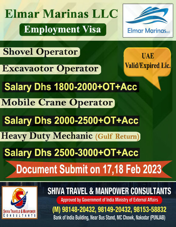 UAE ਦੀ Elmar Marinas LLC Company ਨੂੰ ਕਾਰੀਗਰਾਂ ਦੀ ਭਾਰੀ ਸੰਖਿਆਂ ਵਿੱਚ ਲੋੜ ਹੈ ਚੰਗੀ ਤਨਖਾਹ, ਉਵਰ ਟਾਇਮ ਅਤੇ ਹੋਰ ਸਹੂਲਤਾਂ l Document Submit On 17,18 Fab 2023 ਸੰਪਰਕ ਕਰੋ . Shiva Travel & manpowar Consultants 9814920432 ਸਾਡਾ whatsapp ਗਰੁੱਪ join ਕਰੋ ਨਵੀ ਡਿਮਾਂਡ ਲਈ https://chat.whatsapp.com/F88Q4Bpm089KHXCVk6LENt Visit us: https://shivatradetestcentre.com/applynow/ ਹੋਰ ਡੀਮਾਂਡ ਲਈ…
