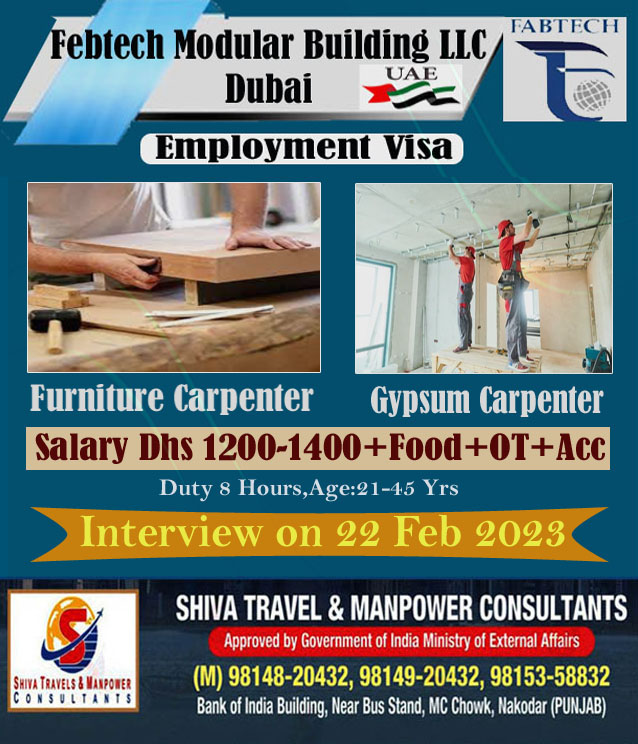 UAE ਦੀ Febtech Modular Building LLC Company ਨੂੰ ਕਾਰੀਗਰਾਂ ਦੀ ਭਾਰੀ ਸੰਖਿਆਂ ਵਿੱਚ ਲੋੜ ਹੈ ਚੰਗੀ ਤਨਖਾਹ, ਉਵਰ ਟਾਇਮ ਅਤੇ ਹੋਰ ਸਹੂਲਤਾਂ l Interview On 22 Fab 2023 ਸੰਪਰਕ ਕਰੋ . Shiva Travel & manpowar Consultants 9814920432 ਸਾਡਾ whatsapp ਗਰੁੱਪ join ਕਰੋ ਨਵੀ ਡਿਮਾਂਡ ਲਈ https://chat.whatsapp.com/F88Q4Bpm089KHXCVk6LENt Visit us: https://shivatradetestcentre.com/applynow/ ਹੋਰ ਡੀਮਾਂਡ ਲਈ…