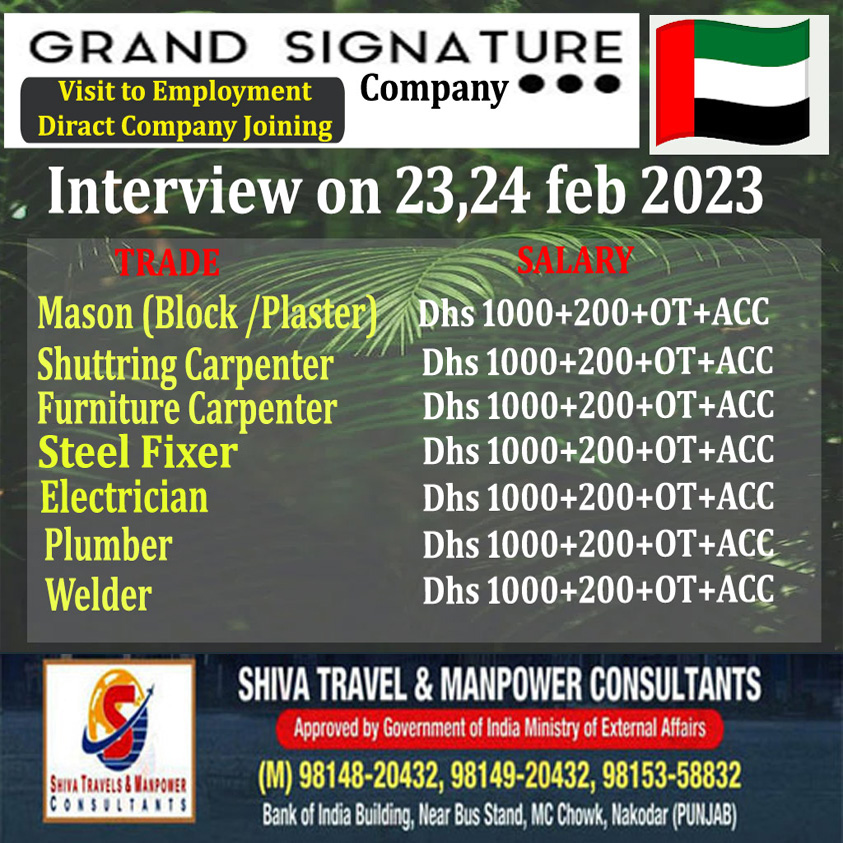 UAE ਦੀ Grand Signature Company ਨੂੰ ਕਾਰੀਗਰਾਂ ਦੀ ਭਾਰੀ ਸੰਖਿਆਂ ਵਿੱਚ ਲੋੜ ਹੈ ਚੰਗੀ ਤਨਖਾਹ, ਉਵਰ ਟਾਇਮ ਅਤੇ ਹੋਰ ਸਹੂਲਤਾਂ l Interview On 23, 24 Fab 2023 ਸੰਪਰਕ ਕਰੋ . Shiva Travel & manpowar Consultants 9814920432 ਸਾਡਾ whatsapp ਗਰੁੱਪ join ਕਰੋ ਨਵੀ ਡਿਮਾਂਡ ਲਈ https://chat.whatsapp.com/F88Q4Bpm089KHXCVk6LENt Visit us: https://shivatradetestcentre.com/applynow/ ਹੋਰ ਡੀਮਾਂਡ ਲਈ ਜਾਂ…