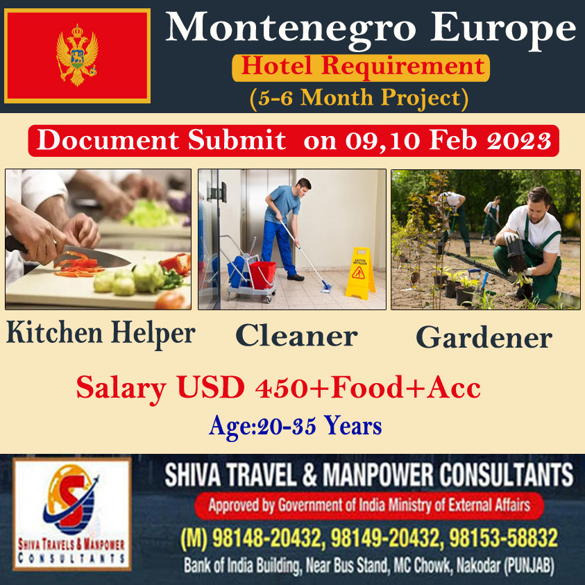 Montenegro ਦੀ Company ਨੂੰ ਕਾਰੀਗਰਾਂ ਦੀ ਭਾਰੀ ਸੰਖਿਆਂ ਵਿੱਚ ਲੋੜ ਹੈ ਚੰਗੀ ਤਨਖਾਹ, ਉਵਰ ਟਾਇਮ ਅਤੇ ਹੋਰ ਸਹੂਲਤਾਂ l Document Submit on 09,10 Feb 2023 ਸੰਪਰਕ ਕਰੋ . Shiva Travel & manpowar Consultants 9814920432 ਸਾਡਾ whatsapp ਗਰੁੱਪ join ਕਰੋ ਨਵੀ ਡਿਮਾਂਡ ਲਈ https://chat.whatsapp.com/F88Q4Bpm089KHXCVk6LENt Visit us: https://shivatradetestcentre.com/applynow/ ਹੋਰ ਡੀਮਾਂਡ ਲਈ ਜਾਂ ਹੋਰ ਜਾਣਕਾਰੀ…