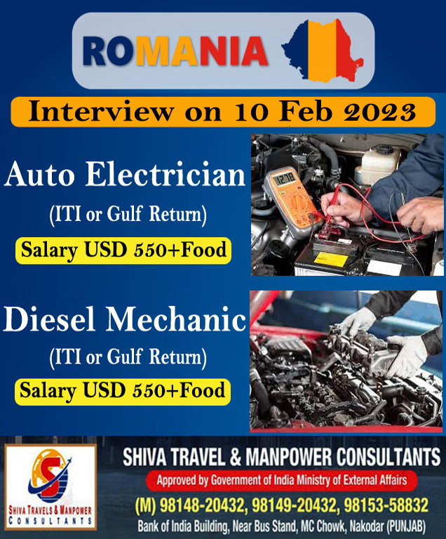 Romania ਦੀ Company ਨੂੰ ਕਾਰੀਗਰਾਂ ਦੀ ਭਾਰੀ ਸੰਖਿਆਂ ਵਿੱਚ ਲੋੜ ਹੈ ਚੰਗੀ ਤਨਖਾਹ, ਉਵਰ ਟਾਇਮ ਅਤੇ ਹੋਰ ਸਹੂਲਤਾਂ l Interview On 10 Feb 2023 ਸੰਪਰਕ ਕਰੋ . Shiva Travel & manpowar Consultants 9814920432 ਸਾਡਾ whatsapp ਗਰੁੱਪ join ਕਰੋ ਨਵੀ ਡਿਮਾਂਡ ਲਈ https://chat.whatsapp.com/F88Q4Bpm089KHXCVk6LENt Visit us: https://shivatradetestcentre.com/applynow/ ਹੋਰ ਡੀਮਾਂਡ ਲਈ ਜਾਂ ਹੋਰ ਜਾਣਕਾਰੀ ਲਈ…