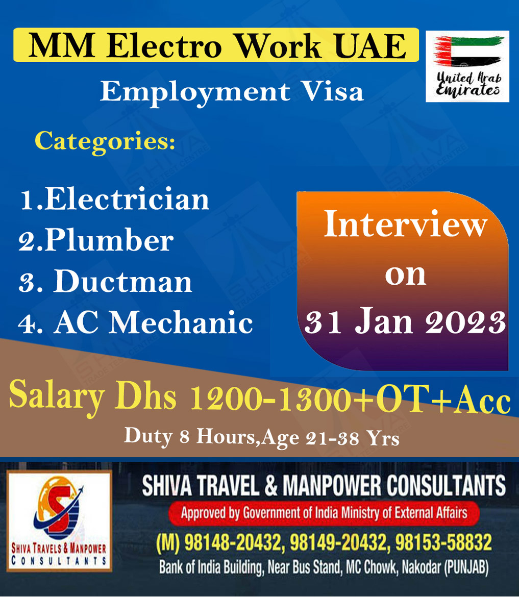 UAE ਦੀ Company ਨੂੰ ਕਾਰੀਗਰਾਂ ਦੀ ਭਾਰੀ ਸੰਖਿਆਂ ਵਿੱਚ ਲੋੜ ਹੈ ਚੰਗੀ ਤਨਖਾਹ, ਉਵਰ ਟਾਇਮ ਅਤੇ ਹੋਰ ਸਹੂਲਤਾਂ l Document Submit On 04,05 Fab 2023 ਸੰਪਰਕ ਕਰੋ . Shiva Travel & manpowar Consultants 9814920432 ਸਾਡਾ whatsapp ਗਰੁੱਪ join ਕਰੋ ਨਵੀ ਡਿਮਾਂਡ ਲਈ https://chat.whatsapp.com/F88Q4Bpm089KHXCVk6LENt Visit us: https://shivatradetestcentre.com/applynow/ ਹੋਰ ਡੀਮਾਂਡ ਲਈ ਜਾਂ ਹੋਰ ਜਾਣਕਾਰੀ…