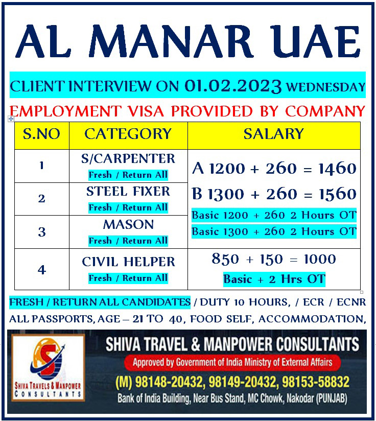 UAE ਦੀ Al Manar Company ਨੂੰ ਕਾਰੀਗਰਾਂ ਦੀ ਭਾਰੀ ਸੰਖਿਆਂ ਵਿੱਚ ਲੋੜ ਹੈ ਚੰਗੀ ਤਨਖਾਹ, ਉਵਰ ਟਾਇਮ ਅਤੇ ਹੋਰ ਸਹੂਲਤਾਂ l Interview On 01 Fab 2023 ਸੰਪਰਕ ਕਰੋ . Shiva Travel & manpowar Consultants 9814920432 ਸਾਡਾ whatsapp ਗਰੁੱਪ join ਕਰੋ ਨਵੀ ਡਿਮਾਂਡ ਲਈ https://chat.whatsapp.com/F88Q4Bpm089KHXCVk6LENt Visit us: https://shivatradetestcentre.com/applynow/ ਹੋਰ ਡੀਮਾਂਡ ਲਈ ਜਾਂ ਹੋਰ…