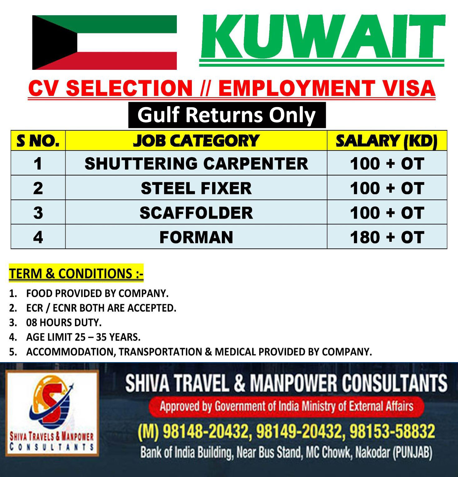 KUWAIT ਦੀ Company ਨੂੰ ਕਾਰੀਗਰਾਂ ਦੀ ਭਾਰੀ ਸੰਖਿਆਂ ਵਿੱਚ ਲੋੜ ਹੈ ਚੰਗੀ ਤਨਖਾਹ, ਉਵਰ ਟਾਇਮ ਅਤੇ ਹੋਰ ਸਹੂਲਤਾਂ l CV SELECTION ਸੰਪਰਕ ਕਰੋ . Shiva Travel & manpowar Consultants 9814920432 ਸਾਡਾ whatsapp ਗਰੁੱਪ join ਕਰੋ ਨਵੀ ਡਿਮਾਂਡ ਲਈ https://chat.whatsapp.com/F88Q4Bpm089KHXCVk6LENt Visit us: https://shivatradetestcentre.com/applynow/ ਹੋਰ ਡੀਮਾਂਡ ਲਈ ਜਾਂ ਹੋਰ ਜਾਣਕਾਰੀ ਲਈ ਸਾਡੇ fb page…