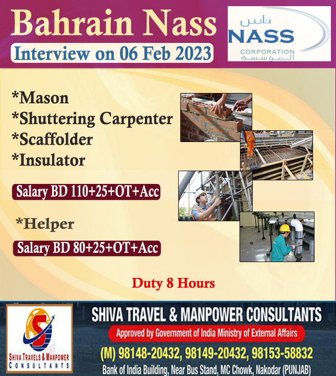 Bahrain ਦੀ Nass Corporation Company ਨੂੰ ਕਾਰੀਗਰਾਂ ਦੀ ਭਾਰੀ ਸੰਖਿਆਂ ਵਿੱਚ ਲੋੜ ਹੈ ਚੰਗੀ ਤਨਖਾਹ, ਉਵਰ ਟਾਇਮ ਅਤੇ ਹੋਰ ਸਹੂਲਤਾਂ l Interview On 06 Fab 2023 ਸੰਪਰਕ ਕਰੋ . Shiva Travel & manpowar Consultants 9814920432 ਸਾਡਾ whatsapp ਗਰੁੱਪ join ਕਰੋ ਨਵੀ ਡਿਮਾਂਡ ਲਈ https://chat.whatsapp.com/F88Q4Bpm089KHXCVk6LENt Visit us: https://shivatradetestcentre.com/applynow/ ਹੋਰ ਡੀਮਾਂਡ ਲਈ ਜਾਂ ਹੋਰ…