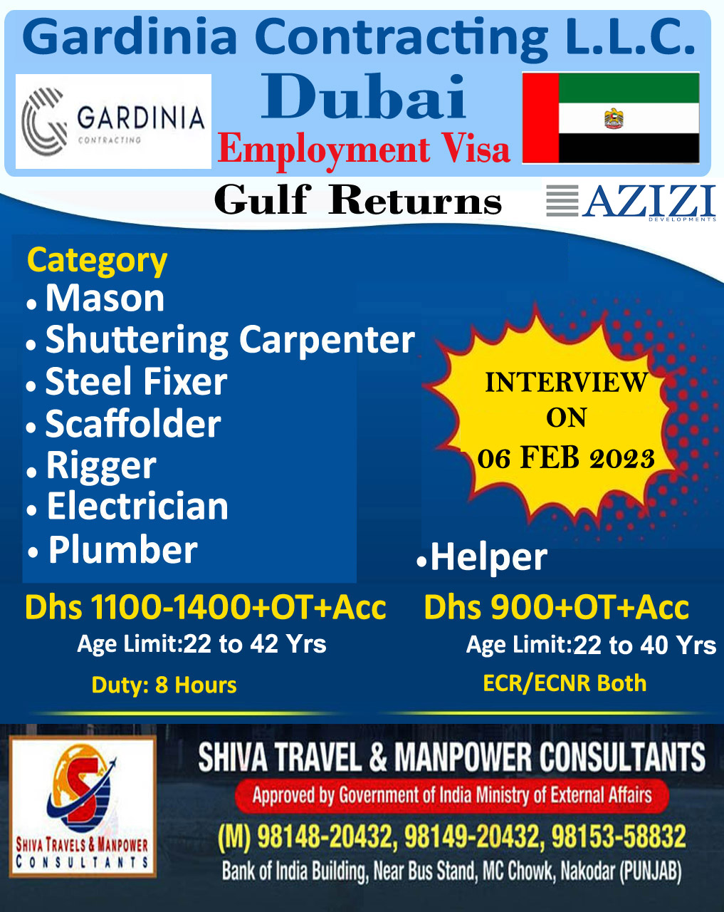 UAE ਦੀ Gardinia Contracting LLC Company ਨੂੰ ਕਾਰੀਗਰਾਂ ਦੀ ਭਾਰੀ ਸੰਖਿਆਂ ਵਿੱਚ ਲੋੜ ਹੈ ਚੰਗੀ ਤਨਖਾਹ, ਉਵਰ ਟਾਇਮ ਅਤੇ ਹੋਰ ਸਹੂਲਤਾਂ l Interview On 06 Fab 2023 ਸੰਪਰਕ ਕਰੋ . Shiva Travel & manpowar Consultants 9814920432 ਸਾਡਾ whatsapp ਗਰੁੱਪ join ਕਰੋ ਨਵੀ ਡਿਮਾਂਡ ਲਈ https://chat.whatsapp.com/F88Q4Bpm089KHXCVk6LENt Visit us: https://shivatradetestcentre.com/applynow/ ਹੋਰ ਡੀਮਾਂਡ ਲਈ ਜਾਂ…