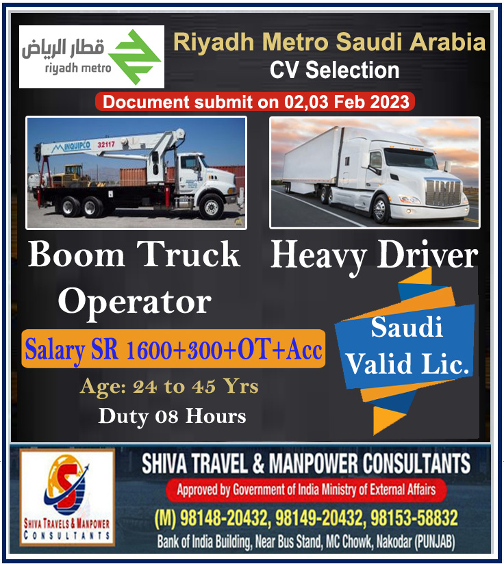 Saudi Arabia ਦੀ Riyadh Metro Company ਨੂੰ ਕਾਰੀਗਰਾਂ ਦੀ ਭਾਰੀ ਸੰਖਿਆਂ ਵਿੱਚ ਲੋੜ ਹੈ ਚੰਗੀ ਤਨਖਾਹ, ਉਵਰ ਟਾਇਮ ਅਤੇ ਹੋਰ ਸਹੂਲਤਾਂ l Document Submit On 02,03 Fab 2023 ਸੰਪਰਕ ਕਰੋ . Shiva Travel & manpowar Consultants 9814920432 ਸਾਡਾ whatsapp ਗਰੁੱਪ join ਕਰੋ ਨਵੀ ਡਿਮਾਂਡ ਲਈ https://chat.whatsapp.com/F88Q4Bpm089KHXCVk6LENt Visit us: https://shivatradetestcentre.com/applynow/ ਹੋਰ ਡੀਮਾਂਡ ਲਈ…