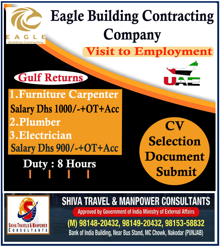 UAE ਦੀ Eagle Building Contracting Company ਨੂੰ ਕਾਰੀਗਰਾਂ ਦੀ ਭਾਰੀ ਸੰਖਿਆਂ ਵਿੱਚ ਲੋੜ ਹੈ ਚੰਗੀ ਤਨਖਾਹ, ਉਵਰ ਟਾਇਮ ਅਤੇ ਹੋਰ ਸਹੂਲਤਾਂ l CV Selection ਸੰਪਰਕ ਕਰੋ . Shiva Travel & manpowar Consultants 9814920432 ਸਾਡਾ whatsapp ਗਰੁੱਪ join ਕਰੋ ਨਵੀ ਡਿਮਾਂਡ ਲਈ https://chat.whatsapp.com/F88Q4Bpm089KHXCVk6LENt Visit us: https://shivatradetestcentre.com/applynow/ ਹੋਰ ਡੀਮਾਂਡ ਲਈ ਜਾਂ ਹੋਰ ਜਾਣਕਾਰੀ ਲਈ…