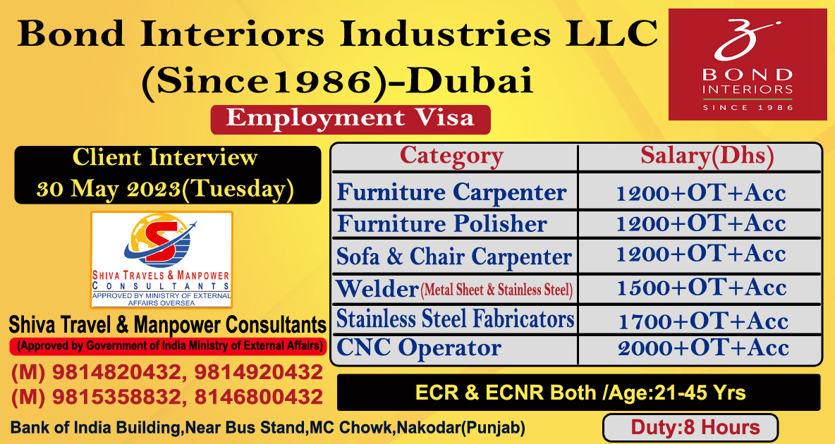 UAE ਦੀ Bond Interiors Industries LLC ਨੂੰ ਕਾਰੀਗਰਾਂ ਦੀ ਭਾਰੀ ਸੰਖਿਆਂ ਵਿੱਚ ਲੋੜ ਹੈ ਚੰਗੀ ਤਨਖਾਹ, ਉਵਰ ਟਾਇਮ ਅਤੇ ਹੋਰ ਸਹੂਲਤਾਂ l Interview on 27 May 2023 ਸੰਪਰਕ ਕਰੋ . Shiva Travel & manpowar Consultants 9814920432 ਸਾਡਾ whatsapp ਗਰੁੱਪ join ਕਰੋ ਨਵੀ ਡਿਮਾਂਡ ਲਈ https://chat.whatsapp.com/F88Q4Bpm089KHXCVk6LENt Visit us: https://shivatradetestcentre.com/applynow/ ਹੋਰ ਡੀਮਾਂਡ…