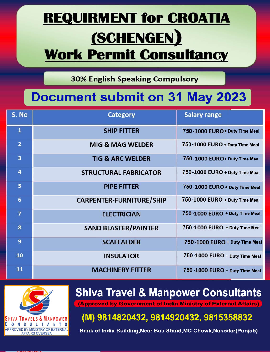 Croatia ਦੀ Company ਨੂੰ ਕਾਰੀਗਰਾਂ ਦੀ ਭਾਰੀ ਸੰਖਿਆਂ ਵਿੱਚ ਲੋੜ ਹੈ ਚੰਗੀ ਤਨਖਾਹ, ਉਵਰ ਟਾਇਮ ਅਤੇ ਹੋਰ ਸਹੂਲਤਾਂ l Document Submit on 31 May 2023 ਸੰਪਰਕ ਕਰੋ . Shiva Travel & manpowar Consultants 9814920432 ਸਾਡਾ whatsapp ਗਰੁੱਪ join ਕਰੋ ਨਵੀ ਡਿਮਾਂਡ ਲਈ https://chat.whatsapp.com/F88Q4Bpm089KHXCVk6LENt Visit us: https://shivatradetestcentre.com/applynow/ ਹੋਰ ਡੀਮਾਂਡ ਲਈ ਜਾਂ…