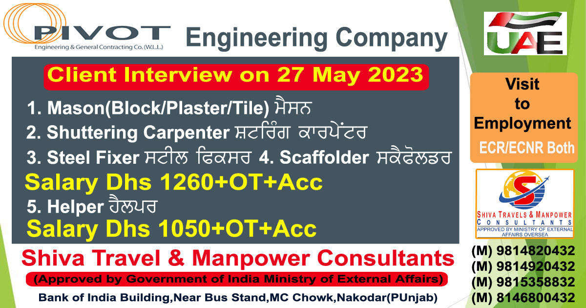 UAE ਦੀ Pivot Company ਨੂੰ ਕਾਰੀਗਰਾਂ ਦੀ ਭਾਰੀ ਸੰਖਿਆਂ ਵਿੱਚ ਲੋੜ ਹੈ ਚੰਗੀ ਤਨਖਾਹ, ਉਵਰ ਟਾਇਮ ਅਤੇ ਹੋਰ ਸਹੂਲਤਾਂ l Interview on 27 May 2023 ਸੰਪਰਕ ਕਰੋ . Shiva Travel & manpowar Consultants 9814920432 ਸਾਡਾ whatsapp ਗਰੁੱਪ join ਕਰੋ ਨਵੀ ਡਿਮਾਂਡ ਲਈ https://chat.whatsapp.com/F88Q4Bpm089KHXCVk6LENt Visit us: https://shivatradetestcentre.com/applynow/ ਹੋਰ ਡੀਮਾਂਡ ਲਈ ਜਾਂ…