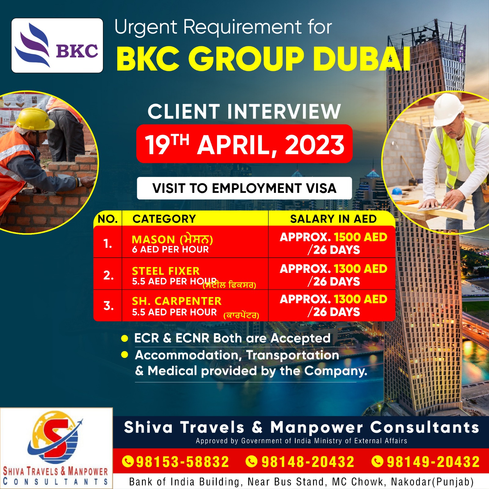 UAE ਦੀ BKC Company ਨੂੰ ਕਾਰੀਗਰਾਂ ਦੀ ਭਾਰੀ ਸੰਖਿਆਂ ਵਿੱਚ ਲੋੜ ਹੈ ਚੰਗੀ ਤਨਖਾਹ, ਉਵਰ ਟਾਇਮ ਅਤੇ ਹੋਰ ਸਹੂਲਤਾਂ l Interview On 19 April 2023 ਸੰਪਰਕ ਕਰੋ . Shiva Travel & manpowar Consultants 9814920432 ਸਾਡਾ whatsapp ਗਰੁੱਪ join ਕਰੋ ਨਵੀ ਡਿਮਾਂਡ ਲਈ https://chat.whatsapp.com/F88Q4Bpm089KHXCVk6LENt Visit us: https://shivatradetestcentre.com/applynow/ ਹੋਰ ਡੀਮਾਂਡ ਲਈ ਜਾਂ ਹੋਰ ਜਾਣਕਾਰੀ……