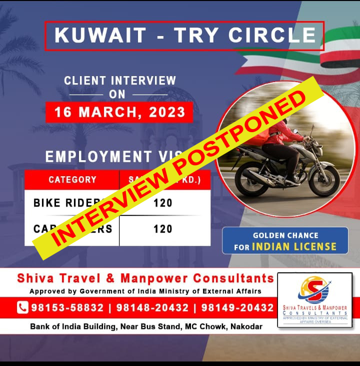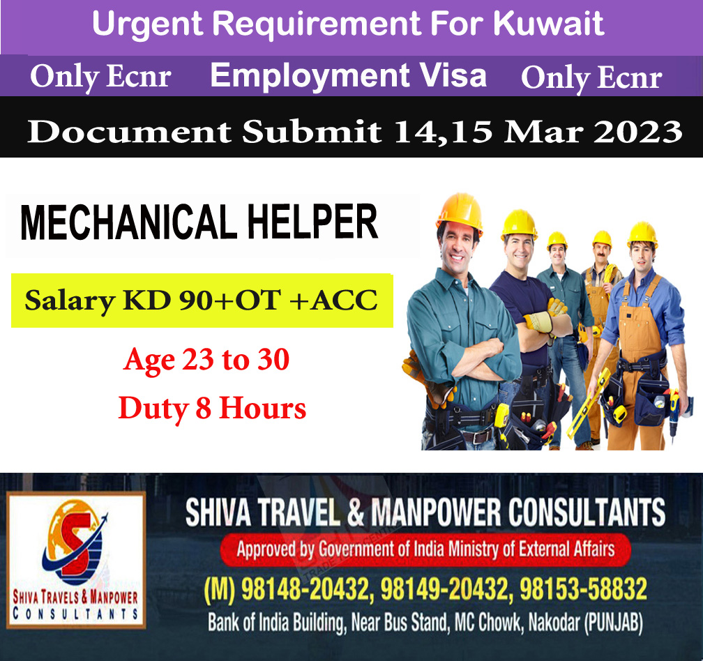 Kuwait ਦੀ Company ਨੂੰ ਕਾਰੀਗਰਾਂ ਦੀ ਭਾਰੀ ਸੰਖਿਆਂ ਵਿੱਚ ਲੋੜ ਹੈ ਚੰਗੀ ਤਨਖਾਹ, ਉਵਰ ਟਾਇਮ ਅਤੇ ਹੋਰ ਸਹੂਲਤਾਂ l Document Submit On 14,15 Mar 2023 ਸੰਪਰਕ ਕਰੋ . Shiva Travel & manpowar Consultants 9814920432 ਸਾਡਾ whatsapp ਗਰੁੱਪ join ਕਰੋ ਨਵੀ ਡਿਮਾਂਡ ਲਈ https://chat.whatsapp.com/F88Q4Bpm089KHXCVk6LENt Visit us: https://shivatradetestcentre.com/applynow/ ਹੋਰ ਡੀਮਾਂਡ ਲਈ ਜਾਂ ਹੋਰ ਜਾਣਕਾਰੀ…