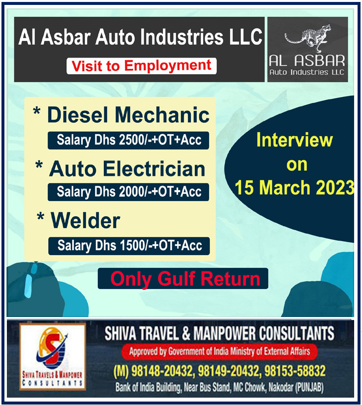 UAE ਦੀ Al Asbar Company ਨੂੰ ਕਾਰੀਗਰਾਂ ਦੀ ਭਾਰੀ ਸੰਖਿਆਂ ਵਿੱਚ ਲੋੜ ਹੈ ਚੰਗੀ ਤਨਖਾਹ, ਉਵਰ ਟਾਇਮ ਅਤੇ ਹੋਰ ਸਹੂਲਤਾਂ l Interview On 15 Mar 2023 ਸੰਪਰਕ ਕਰੋ . Shiva Travel & manpowar Consultants 9814920432 ਸਾਡਾ whatsapp ਗਰੁੱਪ join ਕਰੋ ਨਵੀ ਡਿਮਾਂਡ ਲਈ https://chat.whatsapp.com/F88Q4Bpm089KHXCVk6LENt Visit us: https://shivatradetestcentre.com/applynow/ ਹੋਰ ਡੀਮਾਂਡ ਲਈ ਜਾਂ ਹੋਰ…