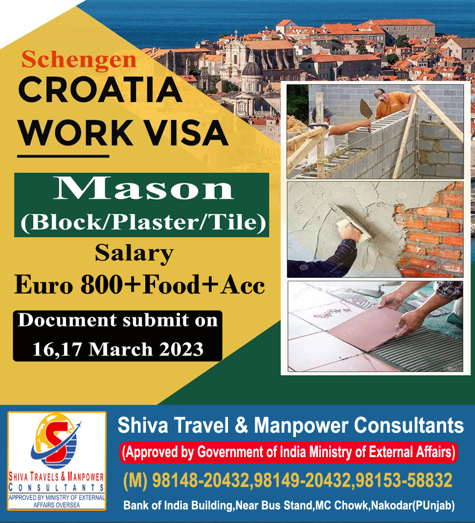 Croatia ਦੀ Company ਨੂੰ ਕਾਰੀਗਰਾਂ ਦੀ ਭਾਰੀ ਸੰਖਿਆਂ ਵਿੱਚ ਲੋੜ ਹੈ ਚੰਗੀ ਤਨਖਾਹ, ਉਵਰ ਟਾਇਮ ਅਤੇ ਹੋਰ ਸਹੂਲਤਾਂ l Document Submit On 16,17 Mar 2023 ਸੰਪਰਕ ਕਰੋ . Shiva Travel & manpowar Consultants 9814920432 ਸਾਡਾ whatsapp ਗਰੁੱਪ join ਕਰੋ ਨਵੀ ਡਿਮਾਂਡ ਲਈ https://chat.whatsapp.com/F88Q4Bpm089KHXCVk6LENt Visit us: https://shivatradetestcentre.com/applynow/ ਹੋਰ ਡੀਮਾਂਡ ਲਈ ਜਾਂ ਹੋਰ ਜਾਣਕਾਰੀ…