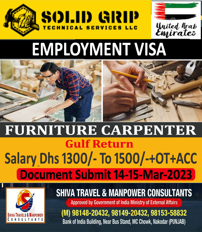 UAE ਦੀ Solid Grip Company ਨੂੰ ਕਾਰੀਗਰਾਂ ਦੀ ਭਾਰੀ ਸੰਖਿਆਂ ਵਿੱਚ ਲੋੜ ਹੈ ਚੰਗੀ ਤਨਖਾਹ, ਉਵਰ ਟਾਇਮ ਅਤੇ ਹੋਰ ਸਹੂਲਤਾਂ l Document Submit On 14,15 Mar 2023 ਸੰਪਰਕ ਕਰੋ . Shiva Travel & manpowar Consultants 9814920432 ਸਾਡਾ whatsapp ਗਰੁੱਪ join ਕਰੋ ਨਵੀ ਡਿਮਾਂਡ ਲਈ https://chat.whatsapp.com/F88Q4Bpm089KHXCVk6LENt Visit us: https://shivatradetestcentre.com/applynow/ ਹੋਰ ਡੀਮਾਂਡ ਲਈ ਜਾਂ…