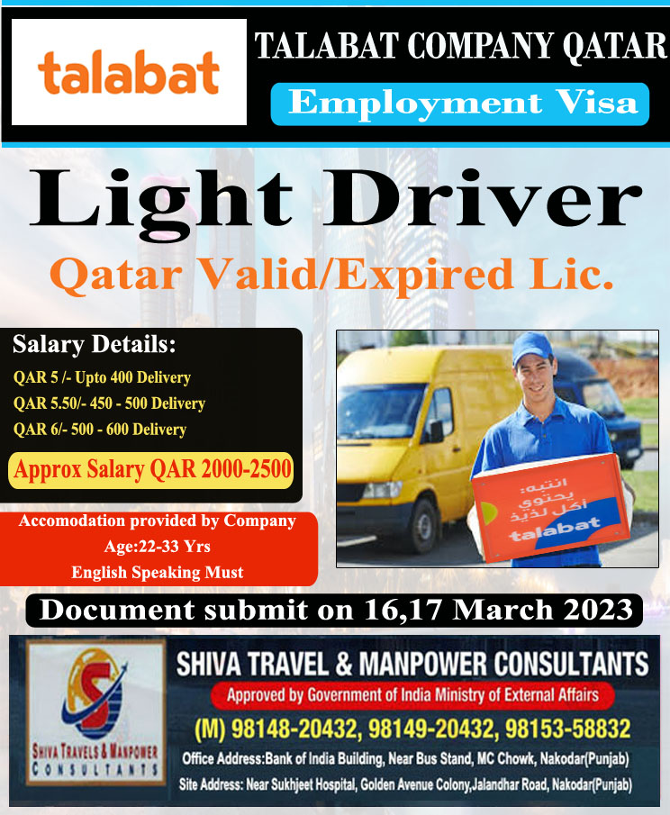 Qatar ਦੀ Talabat Company ਨੂੰ ਕਾਰੀਗਰਾਂ ਦੀ ਭਾਰੀ ਸੰਖਿਆਂ ਵਿੱਚ ਲੋੜ ਹੈ ਚੰਗੀ ਤਨਖਾਹ, ਉਵਰ ਟਾਇਮ ਅਤੇ ਹੋਰ ਸਹੂਲਤਾਂ l Document Submit On 16,17 Mar 2023 ਸੰਪਰਕ ਕਰੋ . Shiva Travel & manpowar Consultants 9814920432 ਸਾਡਾ whatsapp ਗਰੁੱਪ join ਕਰੋ ਨਵੀ ਡਿਮਾਂਡ ਲਈ https://chat.whatsapp.com/F88Q4Bpm089KHXCVk6LENt Visit us: https://shivatradetestcentre.com/applynow/ ਹੋਰ ਡੀਮਾਂਡ ਲਈ ਜਾਂ ਹੋਰ…