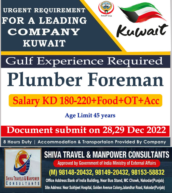 Kuwait ਦੀ Company ਨੂੰ ਕਾਰੀਗਰਾਂ ਦੀ ਭਾਰੀ ਸੰਖਿਆਂ ਵਿੱਚ ਲੋੜ ਹੈ ਚੰਗੀ ਤਨਖਾਹ, ਉਵਰ ਟਾਇਮ ਅਤੇ ਹੋਰ ਸਹੂਲਤਾਂ l CV SELECTION ਸੰਪਰਕ ਕਰੋ . Shiva Travel manpower Consultants 9814920432 ਸਾਡਾ whatsapp ਗਰੁੱਪ join ਕਰੋ ਨਵੀ ਡਿਮਾਂਡ ਲਈ https://chat.whatsapp.com/F88Q4Bpm089KHXCVk6LENt Visit us: https://shivatradetestcentre.com/applynow/ ਹੋਰ ਡੀਮਾਂਡ ਲਈ ਜਾਂ ਹੋਰ ਜਾਣਕਾਰੀ ਲਈ ਸਾਡੇ fb page ਨੂੰ…