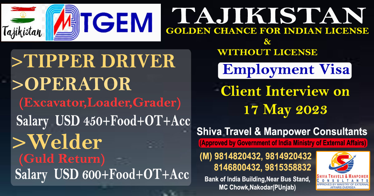 Tajikistan ਦੀ TGEM Company ਨੂੰ ਕਾਰੀਗਰਾਂ ਦੀ ਭਾਰੀ ਸੰਖਿਆਂ ਵਿੱਚ ਲੋੜ ਹੈ ਚੰਗੀ ਤਨਖਾਹ, ਉਵਰ ਟਾਇਮ ਅਤੇ ਹੋਰ ਸਹੂਲਤਾਂ l Interview On 17 May 2023 ਸੰਪਰਕ ਕਰੋ . Shiva Travel & manpowar Consultants 9814920432 ਸਾਡਾ whatsapp ਗਰੁੱਪ join ਕਰੋ ਨਵੀ ਡਿਮਾਂਡ ਲਈ https://chat.whatsapp.com/F88Q4Bpm089KHXCVk6LENt Visit us: https://shivatradetestcentre.com/applynow/ ਹੋਰ ਡੀਮਾਂਡ ਲਈ ਜਾਂ…