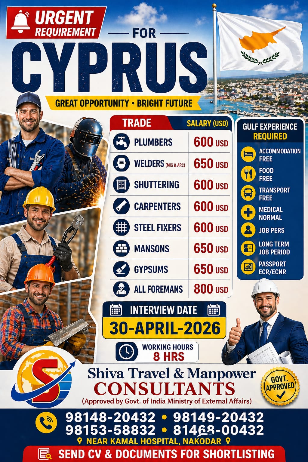 🚨 Dubai Job Opportunity 🚨 ਘੱਟ ਖਰਚੇ ਵਿੱਚ ਦੁਬਈ ਵੀਜ਼ਾ ✈️ ਹੁਣ ਸੁਨਹਿਰਾ ਮੌਕਾ – THK Building Contracting LLC, Dubai 👷♂️ Mason | Carpenter | Steel Fixer | Helper 💰 Salary + Food + OT 🏠 Accommodation Provided 🌍 Work Permit for Gulf & Europe Available 👉 Limited seats – Apply fast! 📍 Shiva Travel & Manpower Consultant, Nakodar 📞 98148 20432 | 98149 20432 📞 81468 00432 | 98766 60432 ✨ “ਹੁਣ ਆਪਣੇ ਸੁਪਨਿਆਂ ਨੂੰ ਉਡਾਣ ਦਿਓ” ✈️